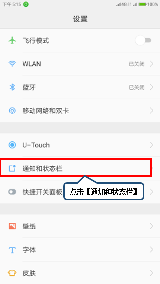 2. 找到并点击【通知和状态栏】,如图1-2所示;