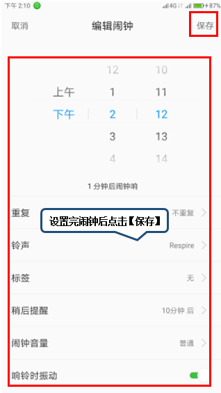 4. 设置完闹钟后点击【保存】,如图2-4所示;