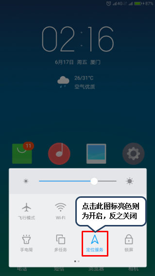 5. 闹钟设置好了以后需要开启定位服务才可开启雨声闹铃提醒,在待机界面向上滑动,点击【定位服务】,亮色为开启,反之关闭,如图2-5至2-6所示;