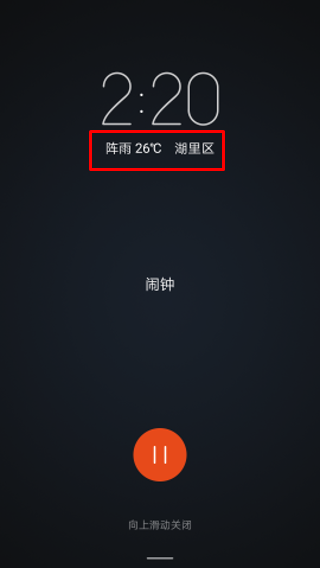 6. 设置完成后,当闹钟响铃时,系统会定位到手机所在地,根据所在地的天气,如果是下雨,闹钟背景音乐会有雨声,铃声更具画面感,闹钟提醒界面还会有所在地的天气提醒,如图2-7所示;