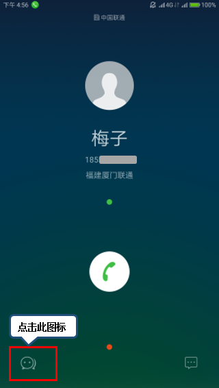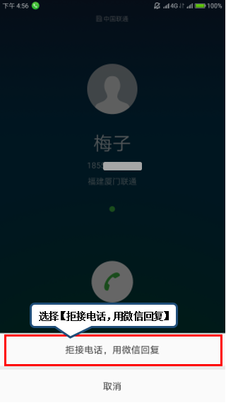 3. 当有来电时,点击左下角微信图标,选择【拒接电话,用微信回复】,即可进入微信回复界面,如图3-4至3-6所示;