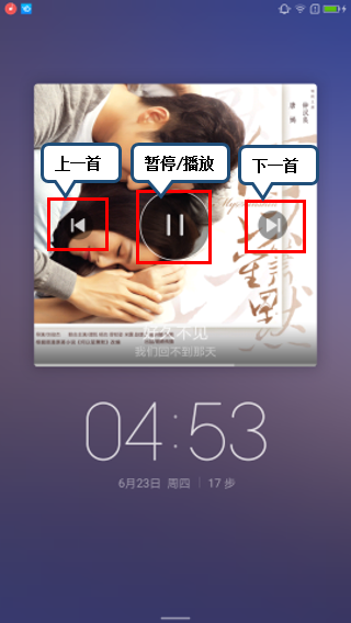 2. 在音乐播放过程中进行锁屏,锁屏界面切换成音乐控制界面,可以上一首/下一首切换音乐,也可以暂停/播放音乐,如图6-3所示;