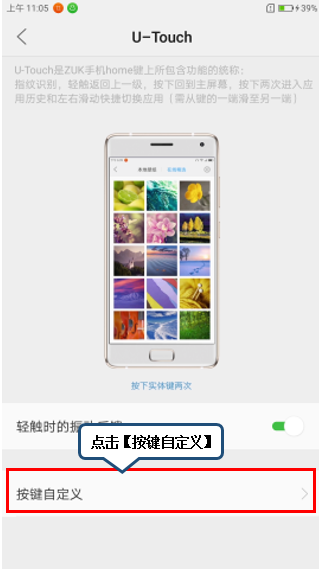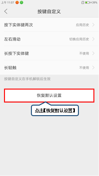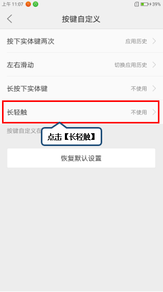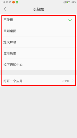 7. 点击【长轻触】,可根据使用习惯选择【不使用】、【回到桌面】、【熄灭屏幕】、【应用历史】、【拉下通知中心】或是【打开一个应用】,如图7-10至7-11所示;