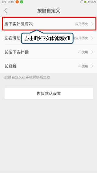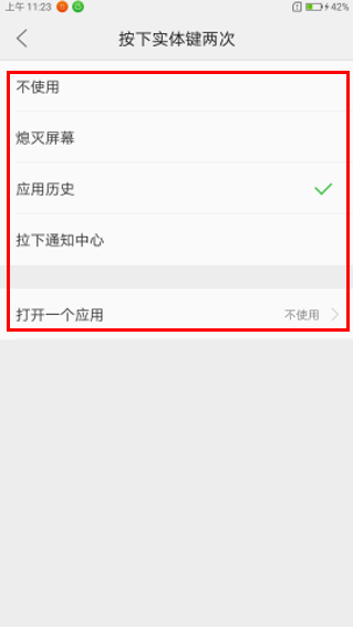 4. 点击【按下实体键两次】,可根据使用习惯选择【不使用】、【熄灭屏幕】、【应用历史】、【拉下通知中心】或是【打开一个应用】,如图7-4至7-5所示;
