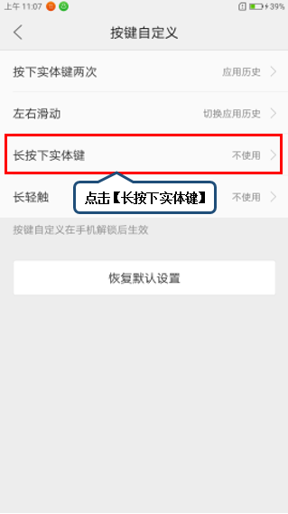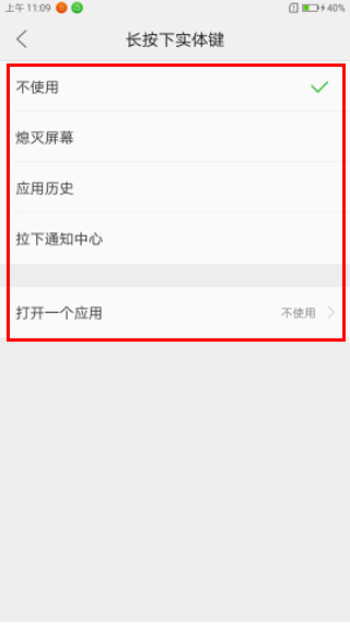 6. 点击【长按下实体键】,可根据使用习惯选择【不使用】、【熄灭屏幕】、【应用历史】、【拉下通知中心】或是【打开一个应用】,如图7-8至7-9所示;
