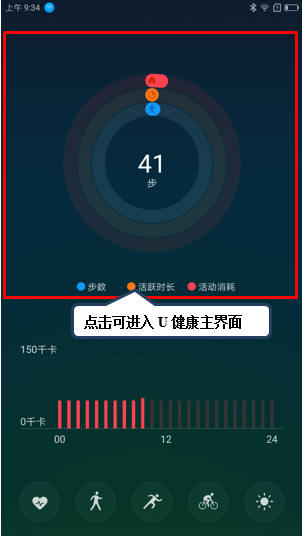 1. 登录ZUK账号后,在【待机界面】向右滑动,进入U健康监测界面,点击今日运动数据界面可进入U健康主界面,如图2-1至2-3所示;