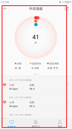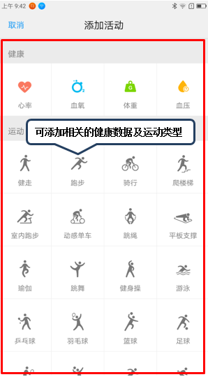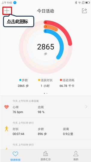 6. 在健康数据界面可查看到今日活动的步数、活跃时长和活动消耗,点击左上角【+】图标,可添加健康数据和运动类型,如图1-6至1-7所示;