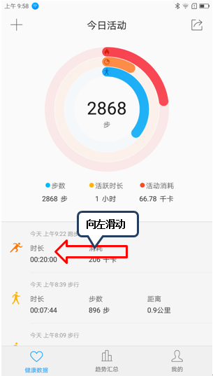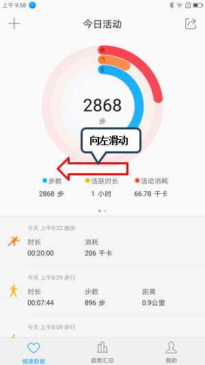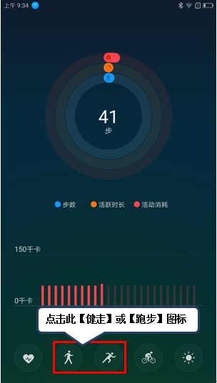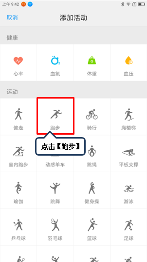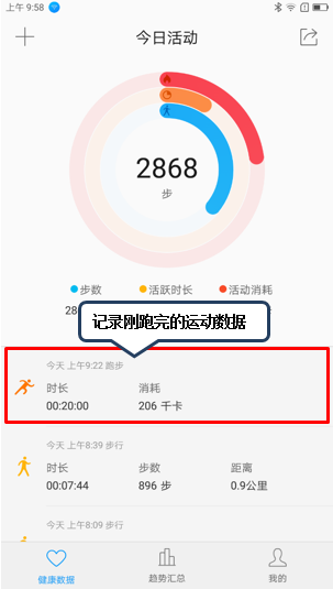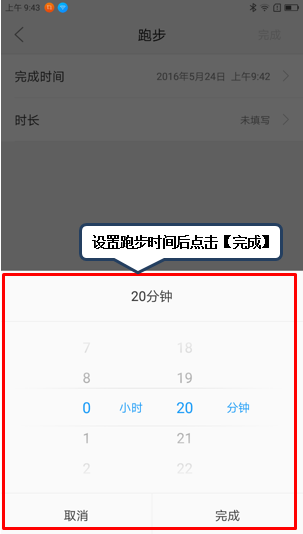 7. 例如点击图1-7【跑步】添加刚跑完的20分钟跑步时间,则可在今日活动界面看到其相关数据,如图1-8至1-12所示;