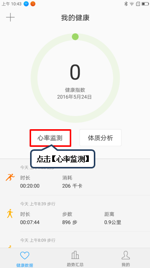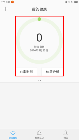 9. 在活动数据界面向左滑动,可查看我的健康指数、心率监测和体质分析,如图1-15至1-16所示;