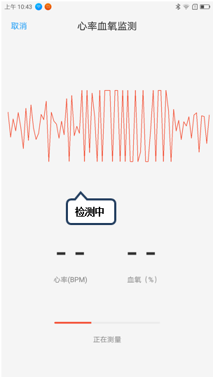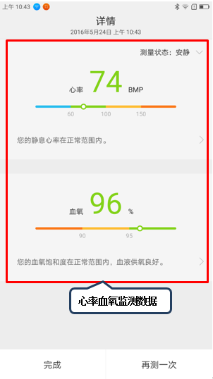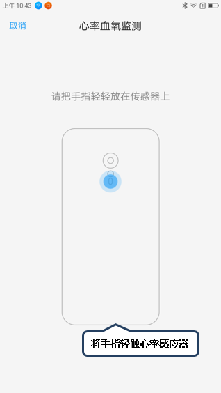 10. 点击【心率监测】,将手指轻触心率感应器,直至检测完成,可根据目前心率血氧的检测数据判断其目前身体的健康状况,如图1-17至1-20所示;