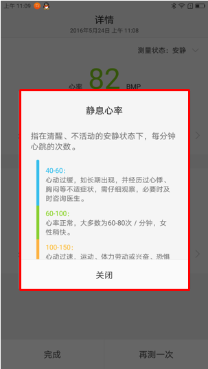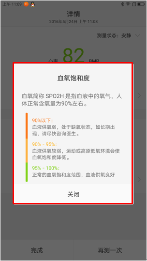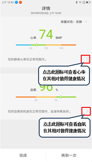 11. 点击【>】图标可查看心率和血氧在相对值对应的身体健康状况,如图1-21至1-23所示;