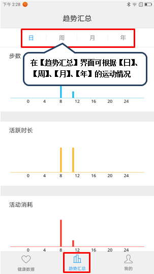 13. 点击【趋势汇总】可查看【日】、【周】、【月】或【年】的运动情况,如图1-27所示;