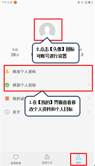 14. 点击【我的】可查看修改的个人资料和个人目标,如图1-28至1-30所示;