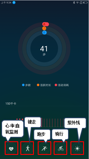 2. 在U健康监测界面,可对心率血氧、健走、跑步、骑行和紫外线进行检测,如图2-4所示;
