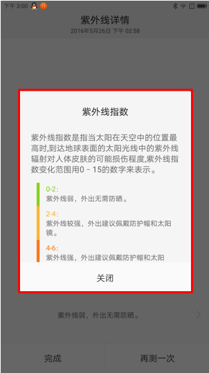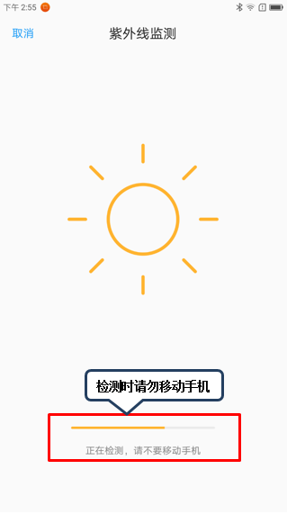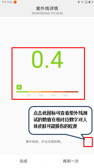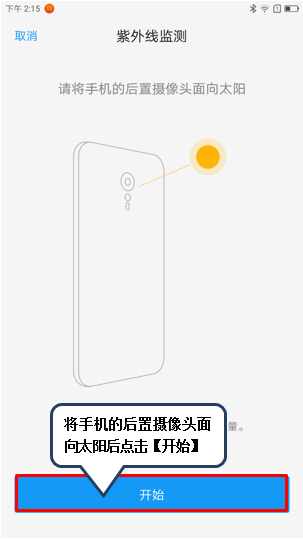 3. 点击【紫外线监测】图标,将手机的后置摄像头面向太阳,点击【开始】,检测过程中请勿移动手机,点击【>】查看紫外线指数变化范围对人体皮肤的可能损伤程度,如图2-5至2-9所示;