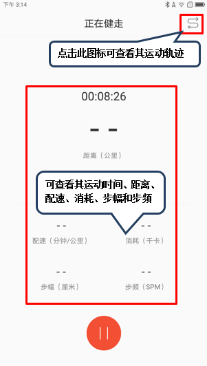 4. 当你在健走或跑步时,可点击【健走】或【跑步】图标,对健走或跑步的距离、配速、消耗、步幅和步频进行测试;点击右上角图标,可查看其运动轨迹,如图2-10至2-12所示;