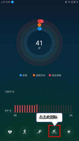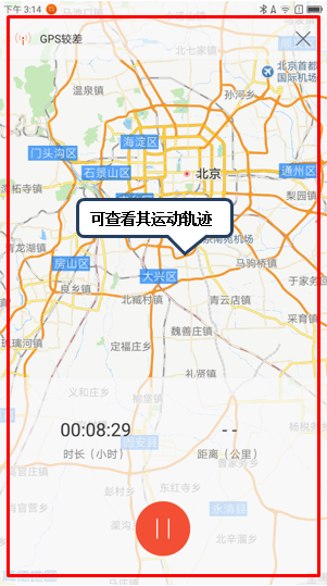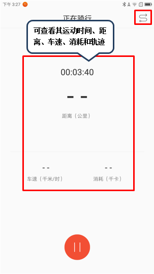 5. 若是在骑行时,点击【骑行】图标,可对骑行的距离、时间、车速、消耗和轨迹进行监测;如图2-13至2-14所示;