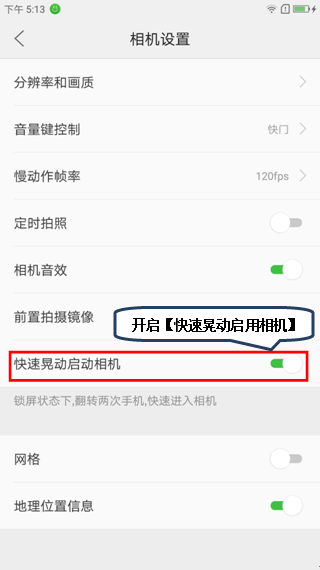 4.开启【快速晃动启动相机】,如图1-4所示;