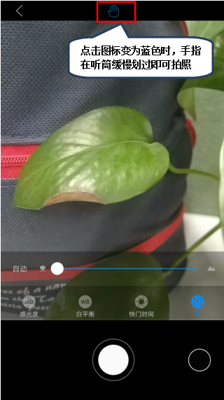 3.点击上方手型图标,当图标变为蓝色时,手指在听筒前缓慢划过即可完成拍照,如图1-3所示;