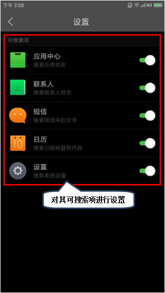 3.弹出搜索的设置界面,可以选择开启或者关闭对应类别的搜素结果的显示,如图1-3所示。