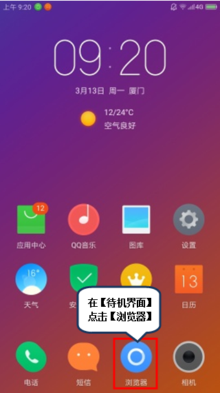 1.在【待机界面】点击【浏览器】,如图1-1所示;