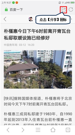 2.打开要分享的网页界面后点击右上角【分享】图标,如图1-2所示;