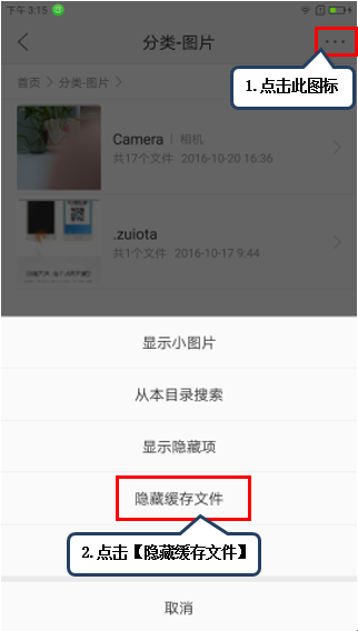 5. 点击右上角【选单】图标后点击【隐藏缓存文件】即可,如图1-5所示;