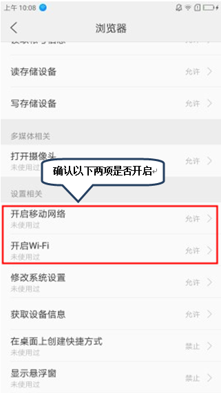 2.路径二:打开【安全中心】-【权限管理】-【按应用管理】-【浏览器】看是否开启了【开启移动网络】或者【开启Wi-Fi】,如图1-1;
