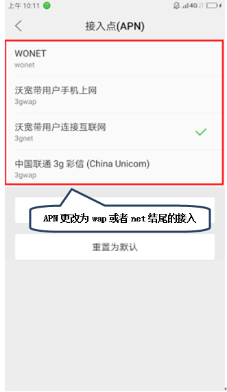3.打开【设置】-【移动网络】-【高级设置】-【接入点(APN)】更改为wap或net结尾的接入点;