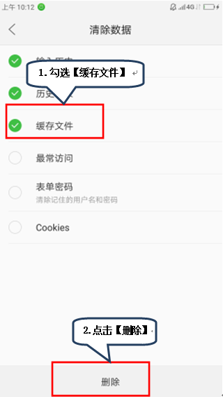 4.在【浏览器快捷栏】点击【设置】-【清除数据】-勾选【缓存文件】-【删除】,如图1-3;