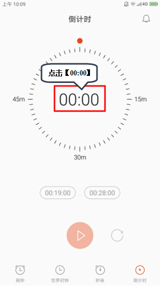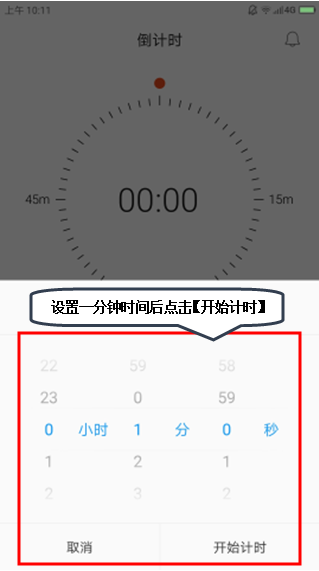 3.点击倒计时界面中央的表盘【00:00】,即可设置倒计时时间,设置一分钟倒计时后点击【开始计时】,如图1-5至1-6所示;