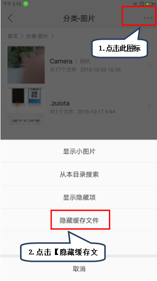 2.点击右上角图标后点击【隐藏缓存文件】,如图1-2。
