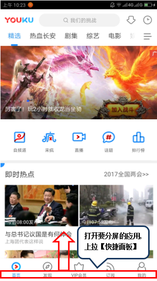 1. 打开要分屏的应用,上拉【快捷面板】,如图2-1所示;
