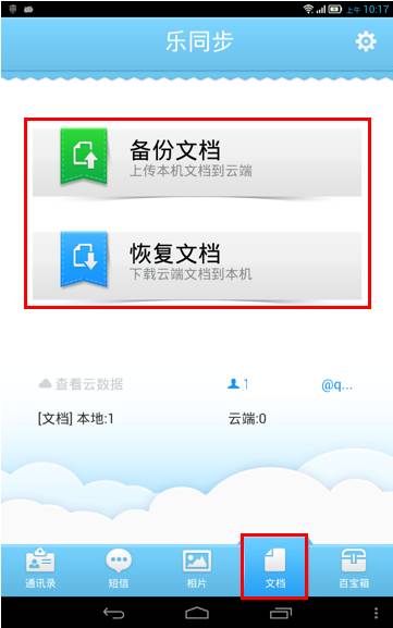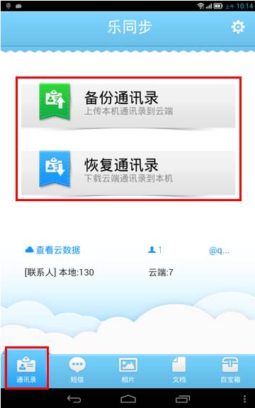 3. 登录之后会进入默认的【相片】功能操作界面:点击左下角【通讯录】,然后点击【备份通讯录】可把机身现有的通讯录全部上传至云端(即服务器);点击【恢复通讯录】则会将备份在服务器的数据恢复到手机当中。在备份或恢复时会将手机端与云端的数据作比较,无更新的数据将不再进行备份或恢复,如图1-4所示;
