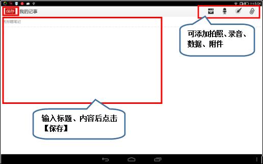 4. 输入标题和内容,点击右上角对应图标可添加拍照、录音、数据、附件,完成后点击左上角【保存】,如图1-6所示;