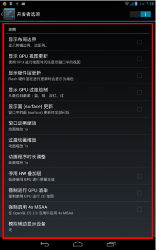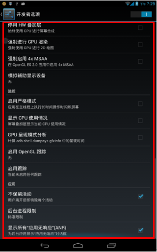 1. 进入【开发者选项】界面,USB调试:连接USB后启用调试模式,可实现计算机和电脑间的数据同步;不锁定屏幕:充电时屏幕不会休眠,选择后可能会导致充电不满;允许模拟位置:软件开发人员对开发的某些定位软件(一般为地图软件)做测试时使用的,功能是模拟手机目前所处的位置(比如手机当前实际位置在中国,但测试软件时要求测试条件为美国,就可以使用该功能进行测试);提交报告错误:这会手机有关当前设备状态的信息,并以电子邮件的形式进行发送。从开始生成错误报告到准备好发送需要一点时间,请耐心等待;桌面备份密码:为桌面完整备份设置密码保护;对SD卡进行读写保护:应用必须请求读取SD卡的权限;电源键菜单错误报告:在电源键菜单中添加提交错误报告的选项;选择调试应用:未设置任何调试应用;等待调试器:调试应用会在执行前等待附加调试器;通过USB验证应用:通过ADB/ADT检查安装的应用是否在有害行为;显示触摸操作:为触摸提供视觉提示;指针位置:屏幕叠加层显示当前触摸数据;显示布局边界:显示剪辑、边距等;显示GUP视图更新:使用GPU进行绘图时闪烁显示窗口中的视图;显示硬件层更新:Flash硬件层在进行更新时会显示为绿色;显示GPU过度绘制:从最优到最差:蓝、绿、淡红、红;显示面(surface)更新:窗口中的面(surface)更新时全部闪烁;窗口动画缩放:可选择关闭动画、动画缩放0.5x、动画缩放1x、动画缩放1.5x、动画缩放2x、动画缩放5x或动画缩放10x;过度动画缩放:可选择关闭动画、动画缩放0.5x、动画缩放1x、动画缩放1.5x、动画缩放2x、动画缩放5x或动画缩放10x;动画程序时长调整:可选择关闭动画、动画缩放0.5x、动画缩放1x、动画缩放1.5x、动画缩放2x、动画缩放5x或动画缩放10x;停用HW叠加层:始终使用GPU进行屏幕合成;强制进行GPU渲染:强制使用GPU进行2D绘画;强制启用4XMSAA:在OpenGL ES 2.0应用中启动4XMSAA;模拟辅助显示设备:无;启用严格模式:应用在主线程上执行长时间操作闪烁屏幕;显示GPU使用情况:屏幕叠加层显示当前CPU使用情况;GPU呈现模式分析:计算 adb shell dumpsys gfxinfo 中的呈现时间;启用Open GL跟踪:可进行Logcat、图形和glGetError跟踪;启用跟踪:可进行Graphics、Input、View、WebView、Window Manager、Activity Manager、Sync Manager、Audio、Video和camera跟踪;不保留活动:用户离开后即销毁每个活动;后台进程限制:可进行后台限制进程数量;显示所有“应用无响应”(ANR);如图1-1至1-3所示。