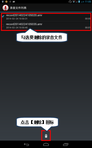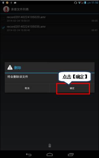 7. 长按录音列表文件,勾选要删除的录音列表,点击下方【删除】图标,可删除录音文件,然后点击【确定】,如图1-8至1-10所示;