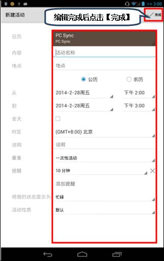 5. 点击【新建活动】进入新建活动界面,可以对日程的类型、时间、主题、地址、提醒等进行设置,设置完成后点击左上角【完成】,如图1-6至1-7所示;