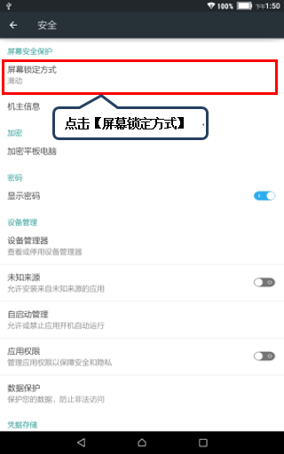 3. 点击【屏幕锁定方式】,如图1-3所示;