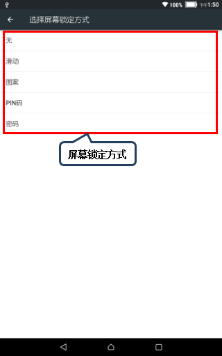 4. 可以看到锁定方式有:【无】、【滑动】、【图案】、【PIN码】和【密码】,如图1-4所示;