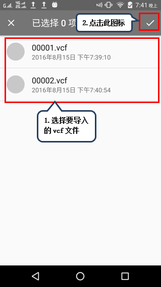 2. 选择要导入vcf文件后点击【完成】图标,可将联系人从SD卡导入到机身,如图2-2所示。