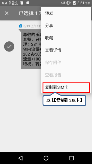 3. 进入短信阅读界面,长按要转发的短信内容,点击右上角【选单图标】再点击【复制到SIM卡】,如图1-4至1-6所示;