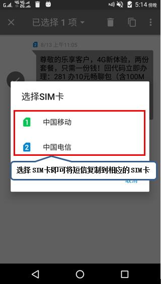 4. 选择SIM卡即可将机身短信复制到SIM卡,如图1-7所示;