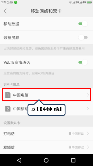 3. 在SIM卡信息上,只能点击作为副卡的SIM卡开启飞行模式;此机型为移动定制机,若插入SIM卡有一张移动卡,另一张则为副卡;若两张都是移动卡,可任意选择一张作为副卡,;若是两张都为不是移动卡,可任选一张可任意选择一张作为副卡;点击【中国电信】,如图1-3所示;