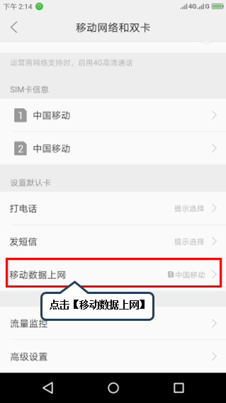 3. 点击【移动数据上网】(注:此机型为移动定制机,只能使用“中国移动”书记网络,需插入的两张卡都为移动卡,或者需要插入两张都不是移动卡才可切换SIM卡进行上网,),如图1-3所示;