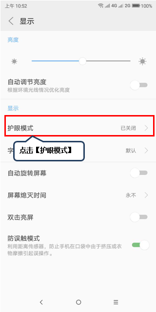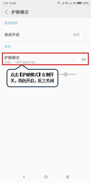 3.点击【护眼模式】,再点击【护眼模式】右侧开关,亮色开启,反之关闭,如图1-3至1-4所示。