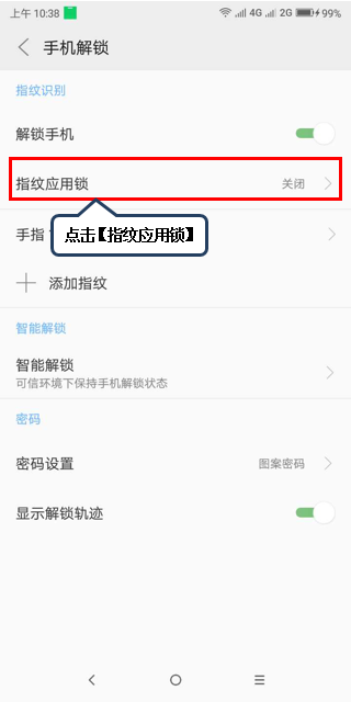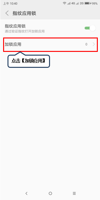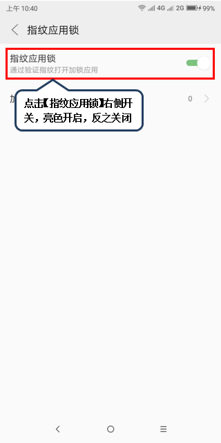 4.点击【指纹应用锁】,点击【指纹应用锁】右侧开关,亮色开启,反之关闭,如图1-3至图1-4所示;