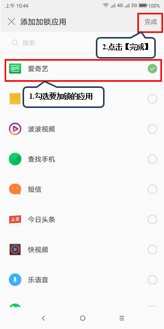 7.勾选要加应用锁的图标,点击【完成】,即可添加该应用锁,如图1-7至图1-8所示。