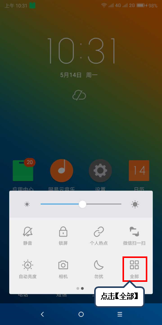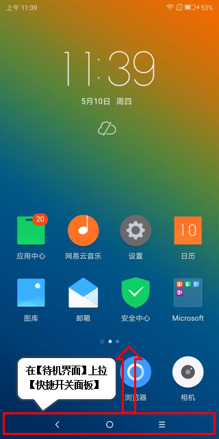 1.在【待机界面】上滑【快捷开关面板】,如图1-1所示;