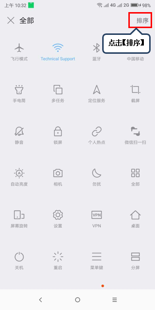 2.向左滑动【快捷开关面板】,点击【全部】,再点击【排序】,如图1-2至1-4所示。
